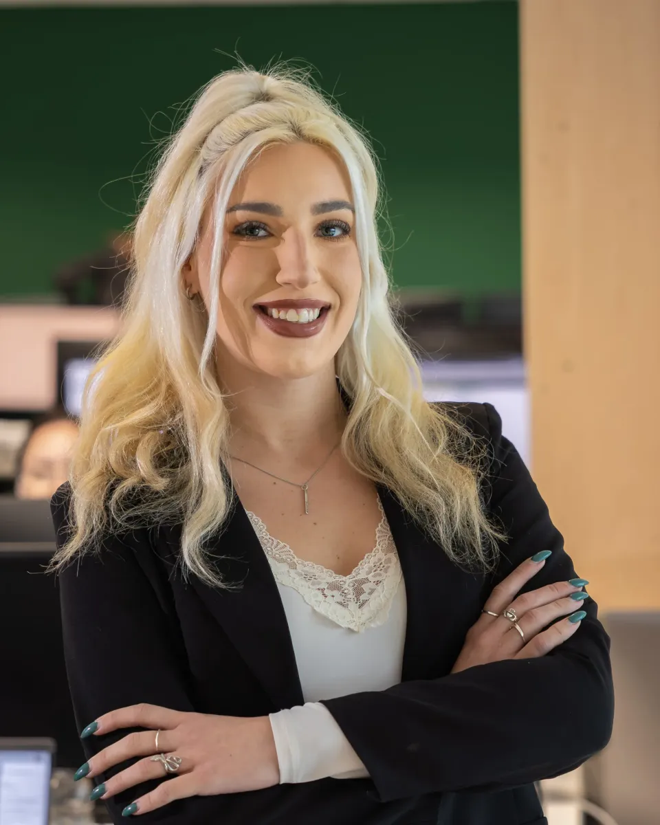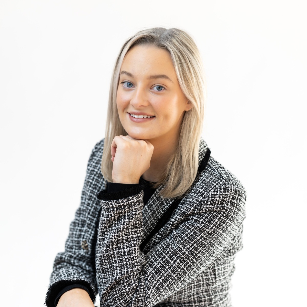 Professional headshot of Sarah, smiling confidently in a checkered blazer, photographed in a bright studio setting.